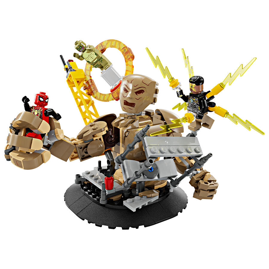 - . مع أماكن متعددة لوضع المجسمات الصغيرة، فإن إمكانيات اللعب والعرض لا حصر لها. يمكن للأطفال لف وتحويل شخصية ساندمان المفصلية واستخدام يديه الهائلة للإمساك بسبايدر مان وهو يتأرجح فوق "حبل" شبكته المرنة.