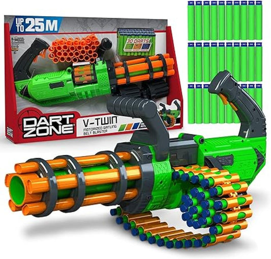 • يعمل بالبطارية ويمنحك أداءً أوتوماتيكياً كاملاً. أمسك "الزناد" للأسفل لتُشغّل العجلات / الحذّافات ثم اسحب الزناد الأساسي للخلف لتُطلق الطلقات حتى 80 قدماً من خلال جهاز الإطلاق مع الحزام الرشاش.