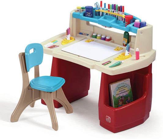 - يتمتع الفنانون الصغار بمساحة كبيرة للانتشار على سطح المكتب الكبير مع الأخاديد المصبوبة للحفاظ على أدوات الكتابة والتلوين بالقرب منك.