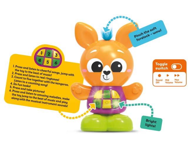 - هذا الكنغر الساحر بأزراره المضيئة وأصواته المبهجة يمنح الأطفال أوقاتًا رائعة من اللعب.