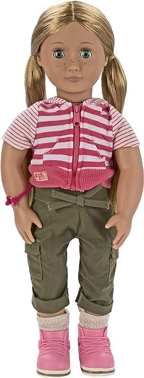 - مقاس 18 بوصة، وهي دمية جميلة قابلة للتعديل بعيون زرقاء تفتح وتغلق، ونمش جذاب، وشعر أشقر طويل ممتع التصفيف
