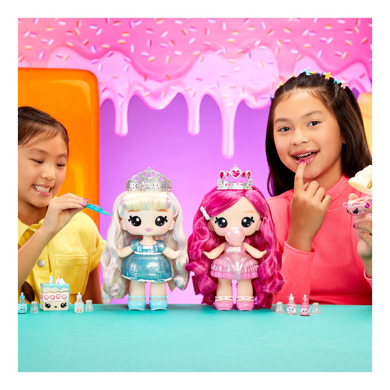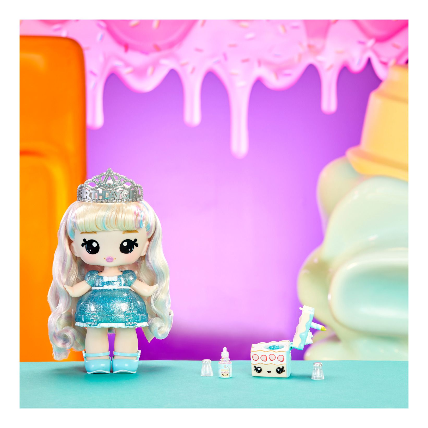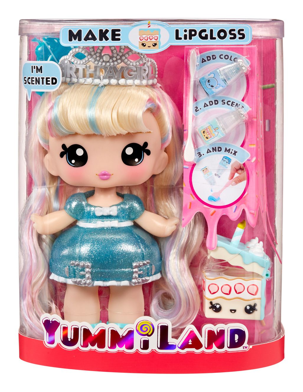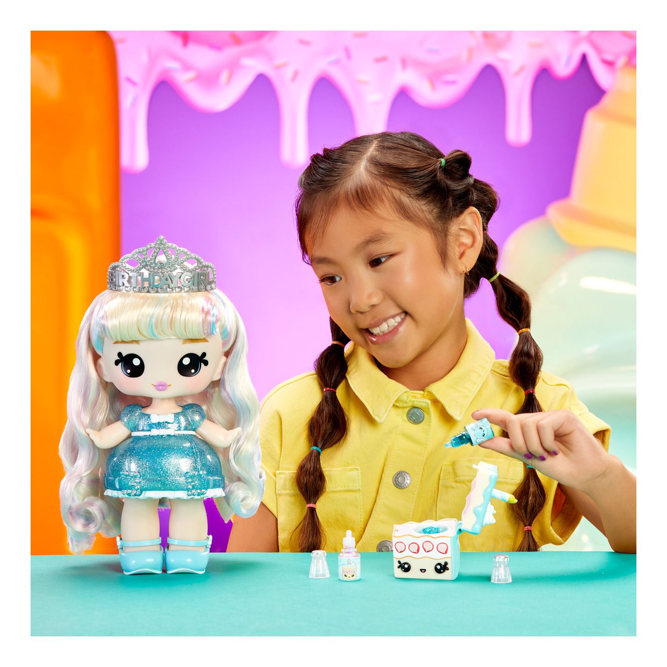 - تأتي دمية كالي بيرث كيك مع فستان عيد ميلادها الأزرق اللامع وحذائها المطابق، واللذين يمكن استخدامهما بالتبادل مع جميع دمى يامي لاند الكبيرة!